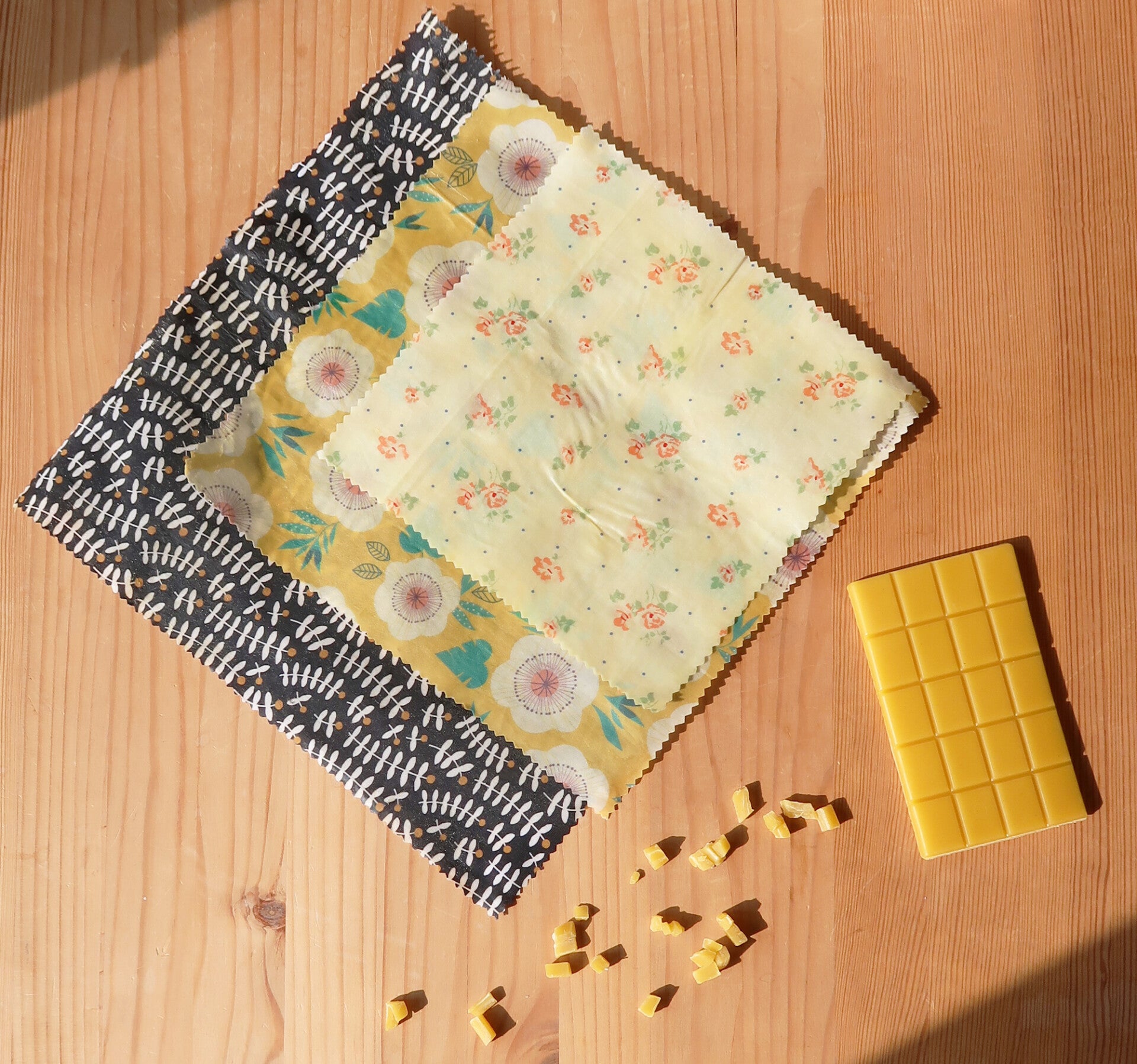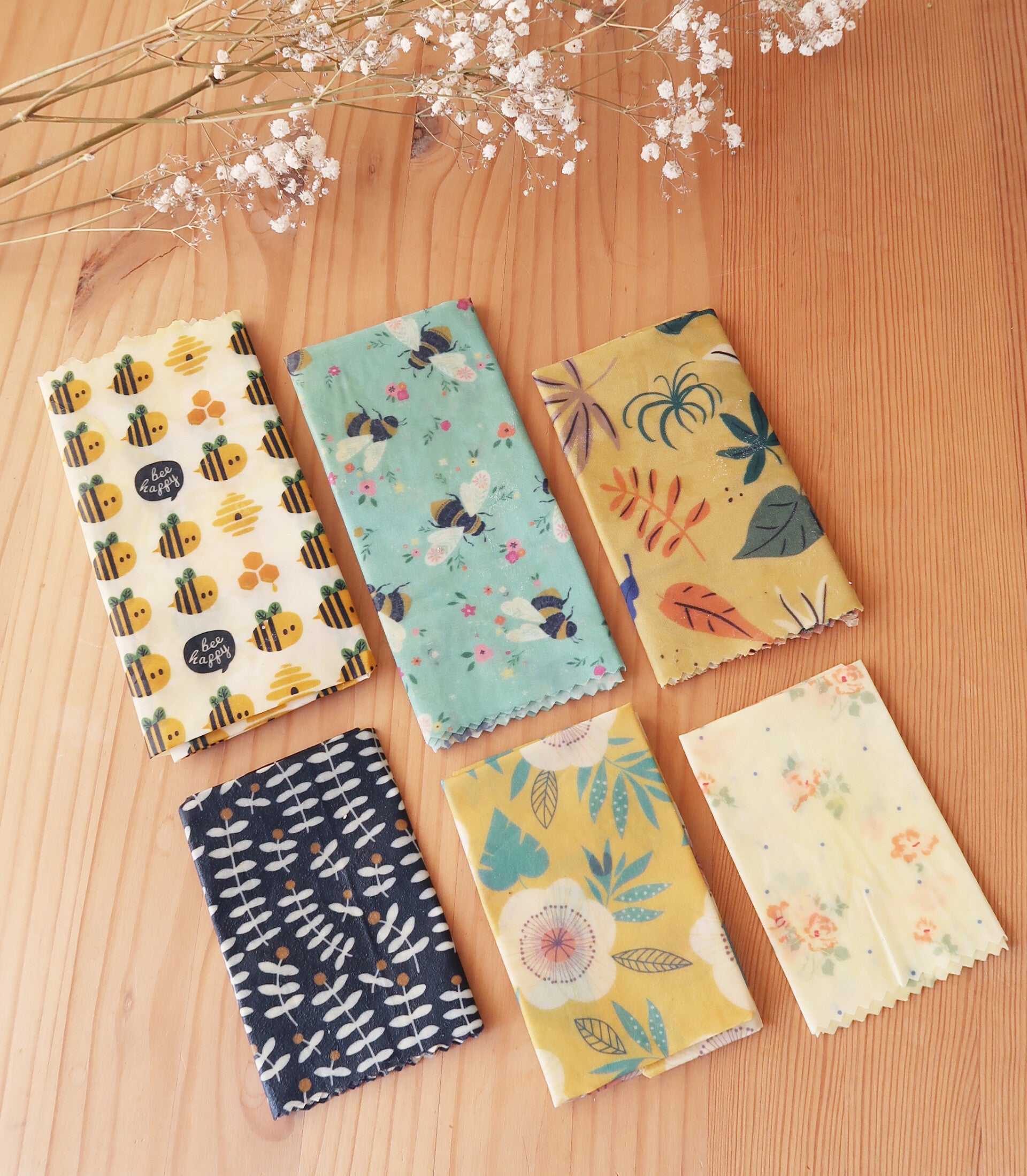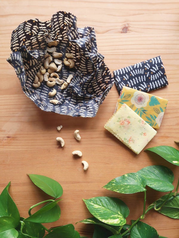 Lot de 3 Bee Wraps (S,M,L), idéal pour réduire vos déchets en remplaçant vos films plastiques et papiers aluminium. Parfait pour emballer et/ou transporter fruits, légumes, fromages, céréales, graines, plats cuisinés, biscuits, et bien d’autres !